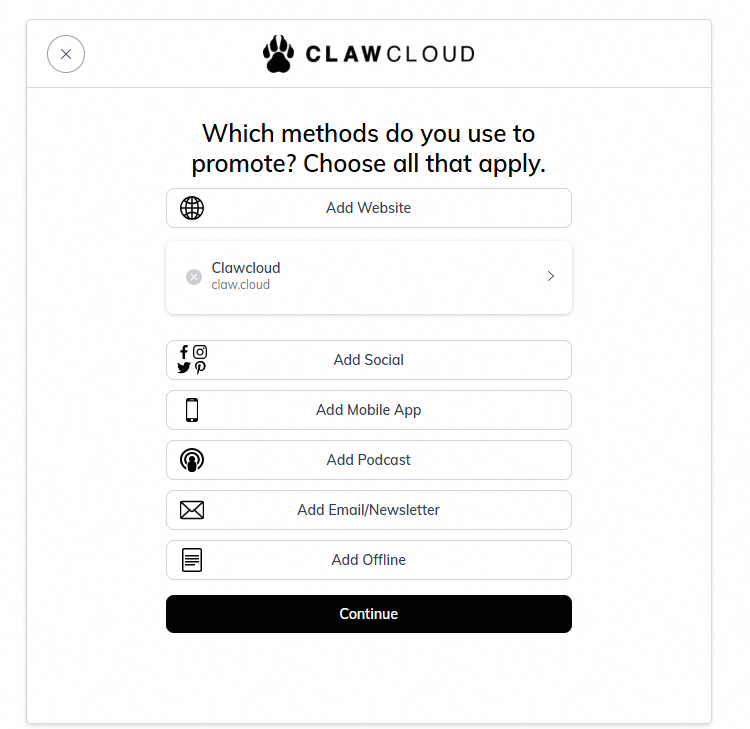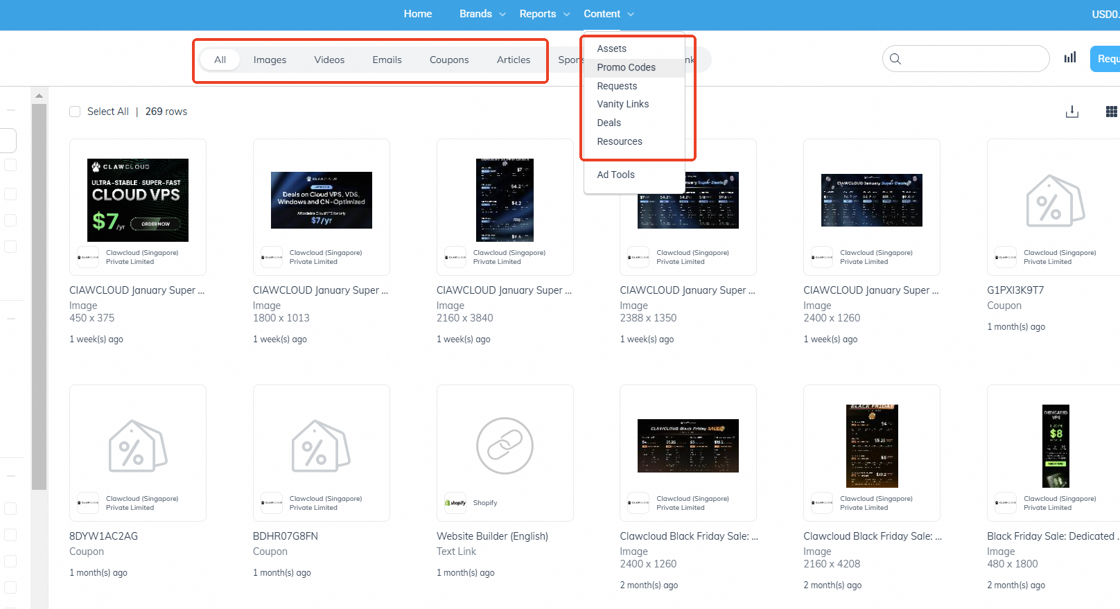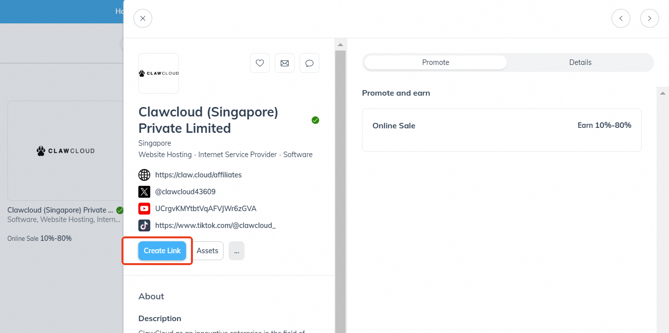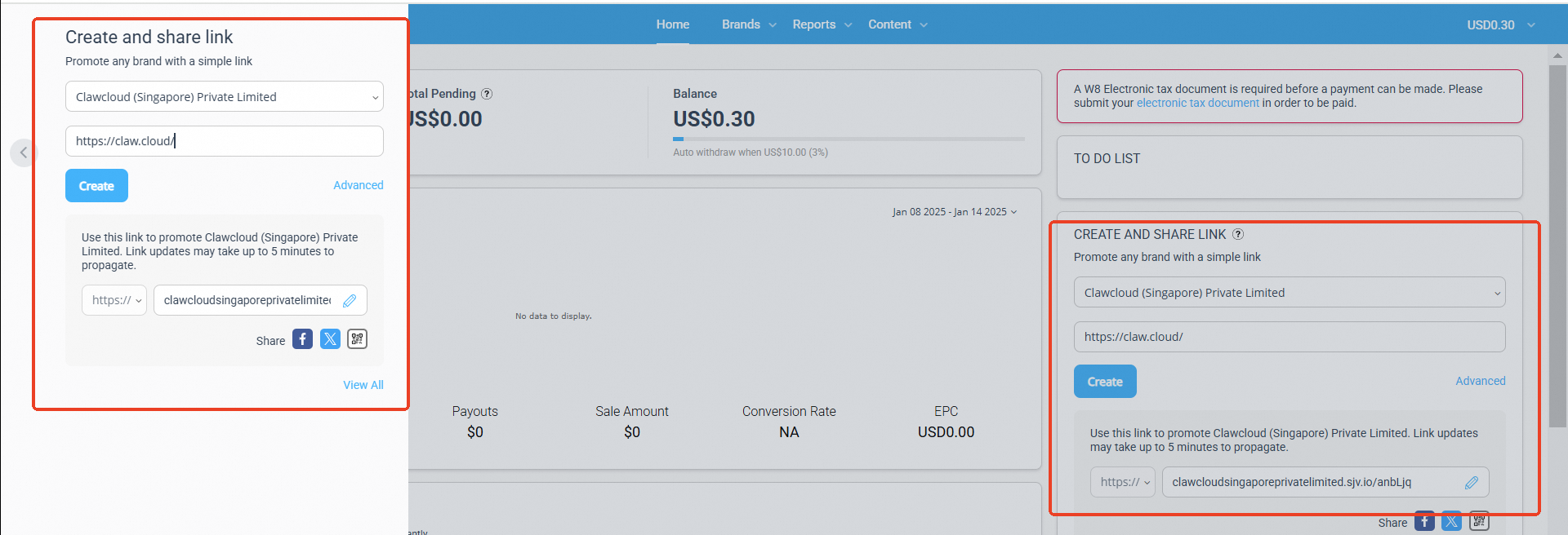 View brands and create promotion links by clicking Brand -> My Brands -> CLAWCLOUD.