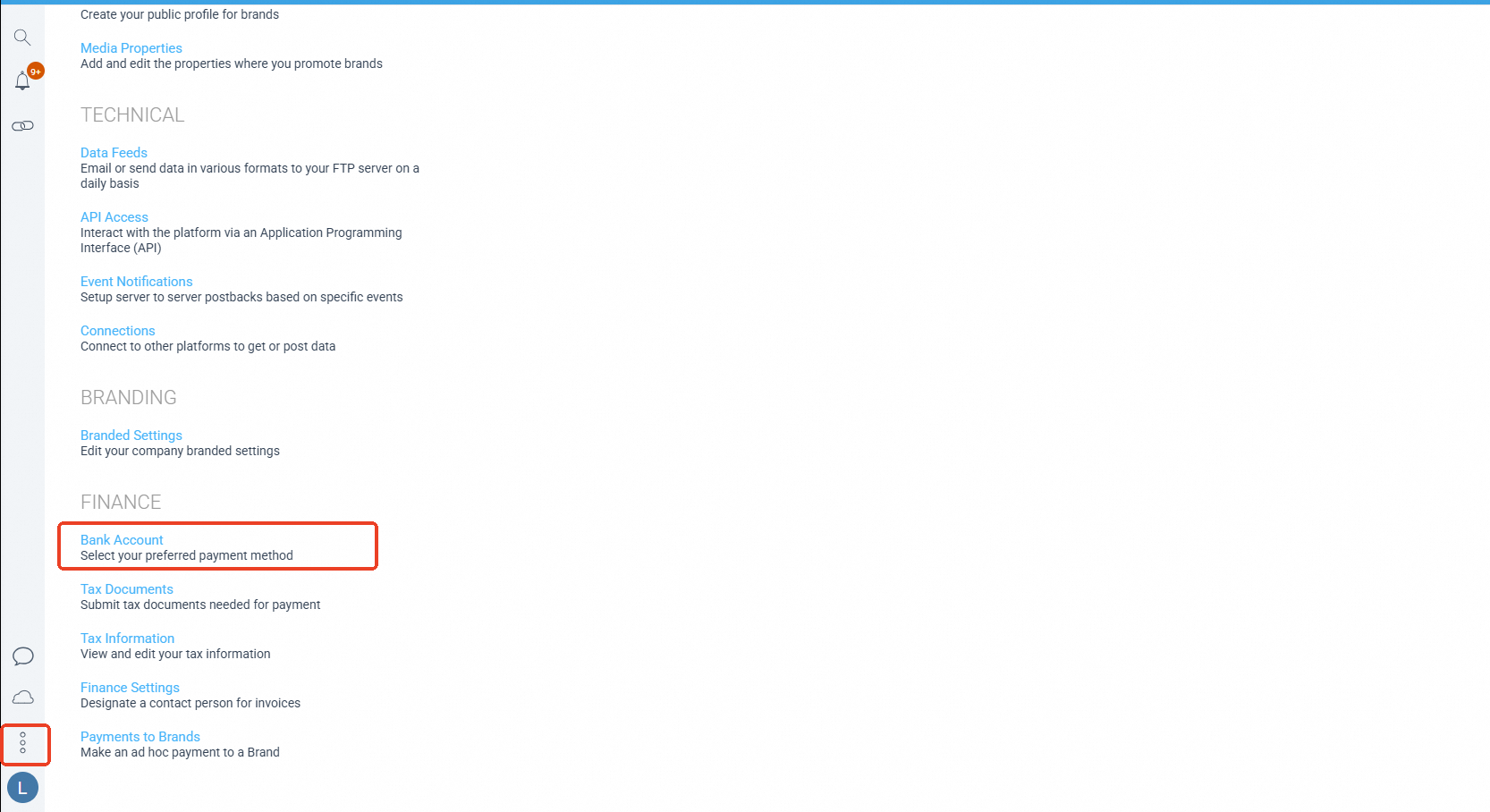 Set up withdrawal methods by clicking the three dots in the lower left corner -> Settings.