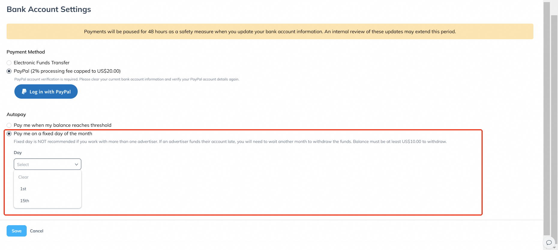 Configure automatic transfers when your account balance reaches a specified amount in USD, or set fixed monthly transfer dates on the 1st or 15th.Balance must be at least US$10.00 to withdraw.
